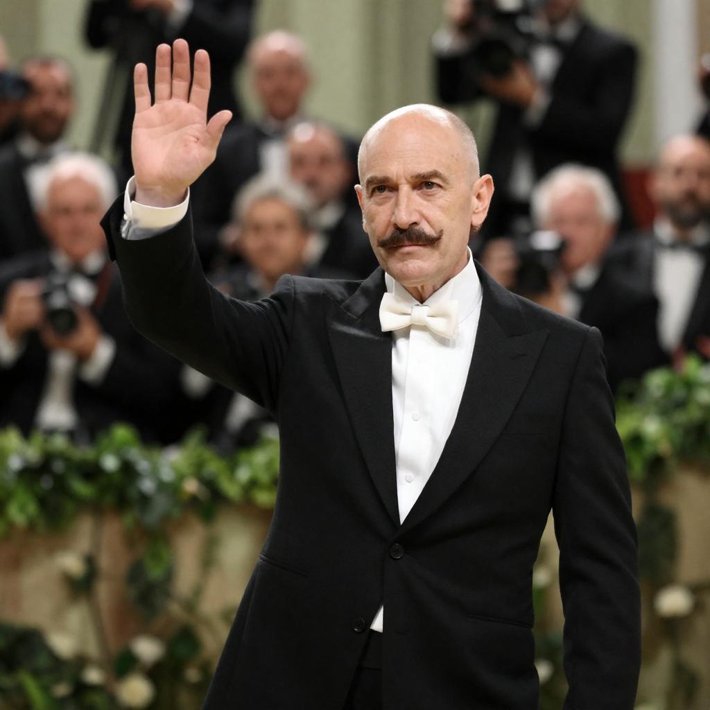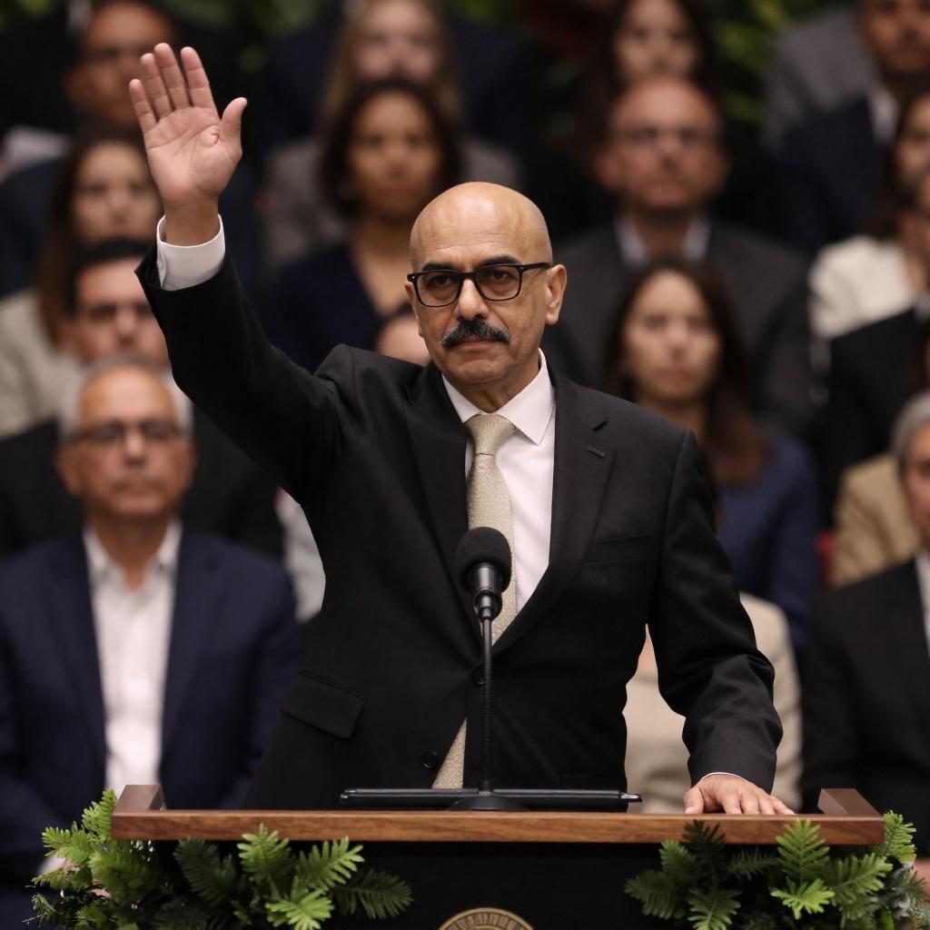Middle-aged man with bald head, mustache, glasses, black suit, white shirt, beige tie, raises right arm, standing at podium. Background: crowded audience in formal attire, serious expressions. Greenery on podium, dim lighting.