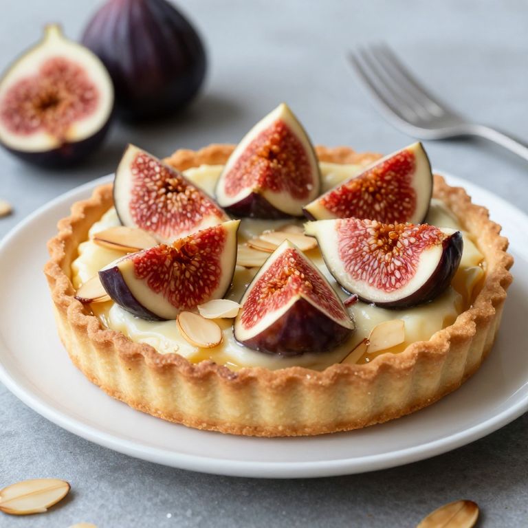 Delicious almond tart topped with creamy custard, fresh fig quarters, and sliced almonds, served on a white plate with a fork in the background. The dessert features a golden flaky crust and ripe figs with a rich red interior.