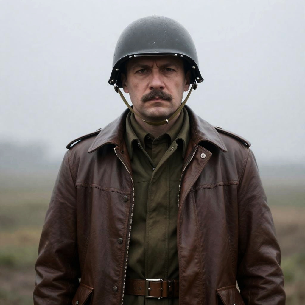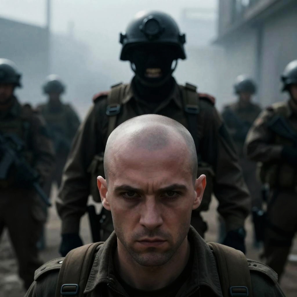 Bald, middle-aged man with a scarred face, intense expression, wearing a dark, camouflage-patterned military uniform, seated in a dimly lit wooden chair, door frames on either side.