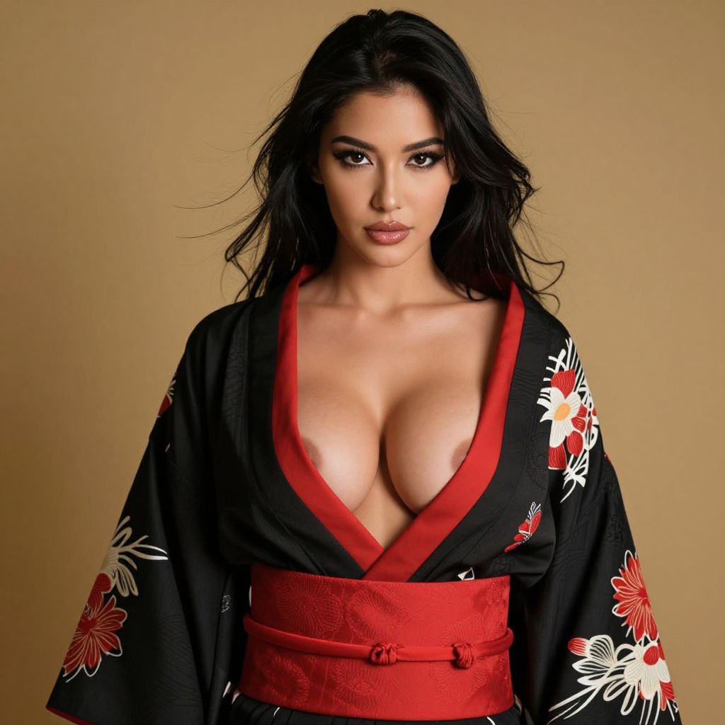 A beautiful woman with a captivating presence, wearing a luxurious black kimono adorned with intricate red embroidery and a matching red belt, exuding elegance and sensuality. Her figure is strikingly defined with big, full breasts and a confident, sexy demeanor, enhancing her alluring aura. She stands gracefully under soft golden light, her eyes shimmering with quiet confidence, her long black hair flowing gently around her shoulders, creating a mesmerizing blend of traditional beauty and modern allure.