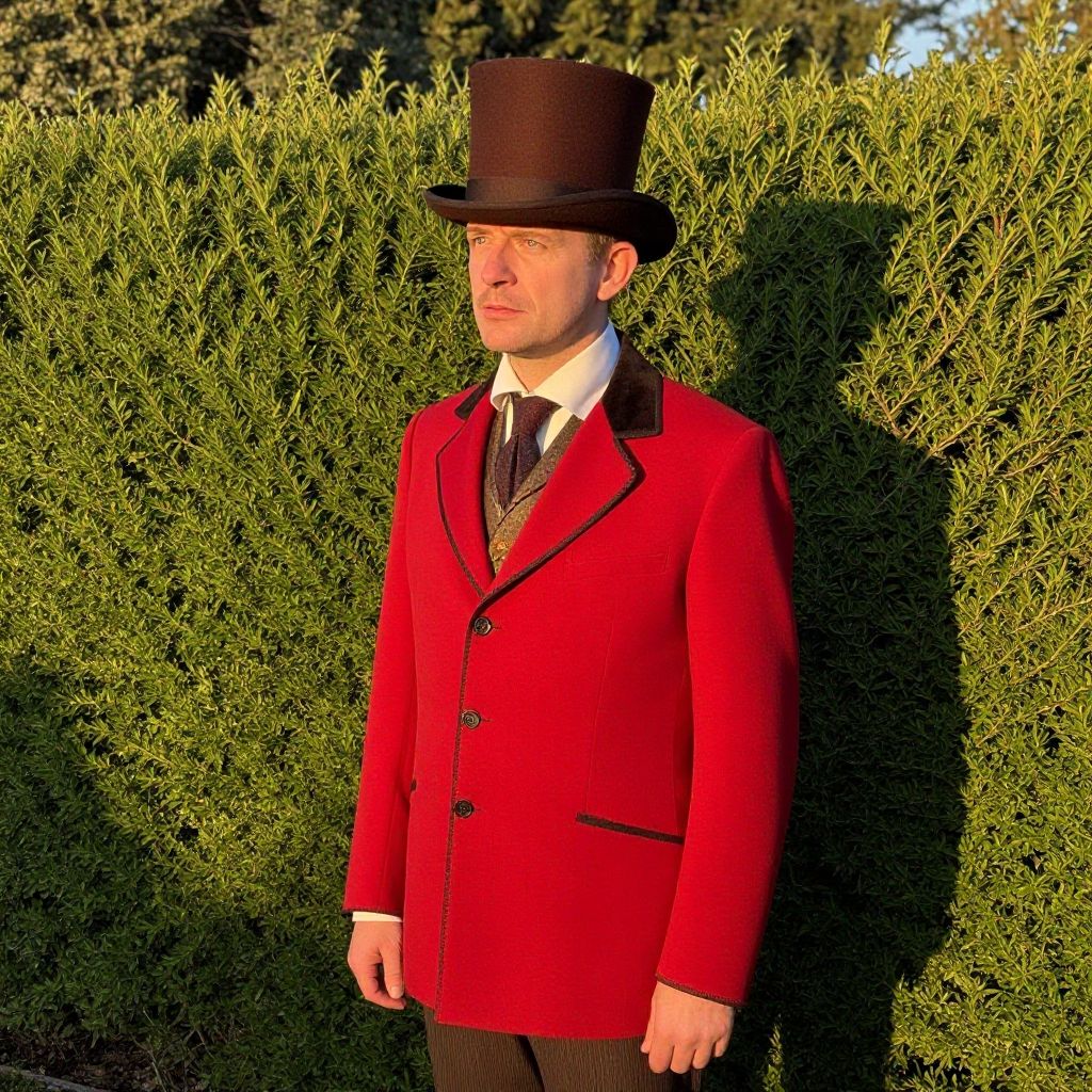 A man in his late 30s with a distinguished facial structure, wearing a vibrant red jacket and a classic brown top hat, stands confidently in front of a dense, well-maintained hedge. The scene is set in a sun-dappled garden with soft green foliage, golden hour lighting casting long shadows, and a subtle breeze that gently ruffles the edges of the hedge. The man has a thoughtful expression, as if pondering the quiet beauty of the moment, adding a touch of charm and timeless elegance to the image.