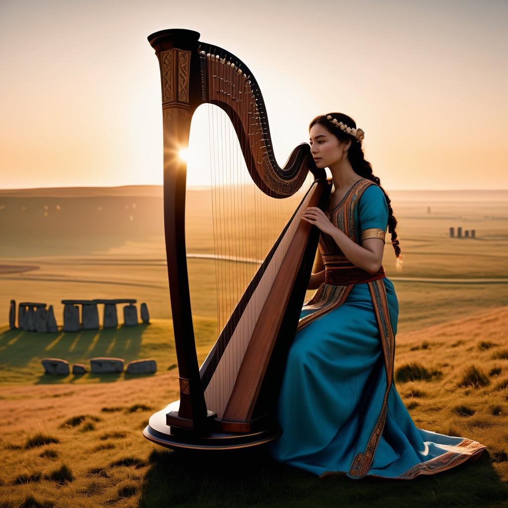 A hyper-realistic portrait of a musician playing a harp in ethnic clothing, positioned on a scenic overlook with Stonehenge framed in the distance. Captured from an elevated vantage point using a wide-angle lens during the golden hour, incorporate music-related props to enhance the cultural richness. High Definition, 8K, cinematic quality.