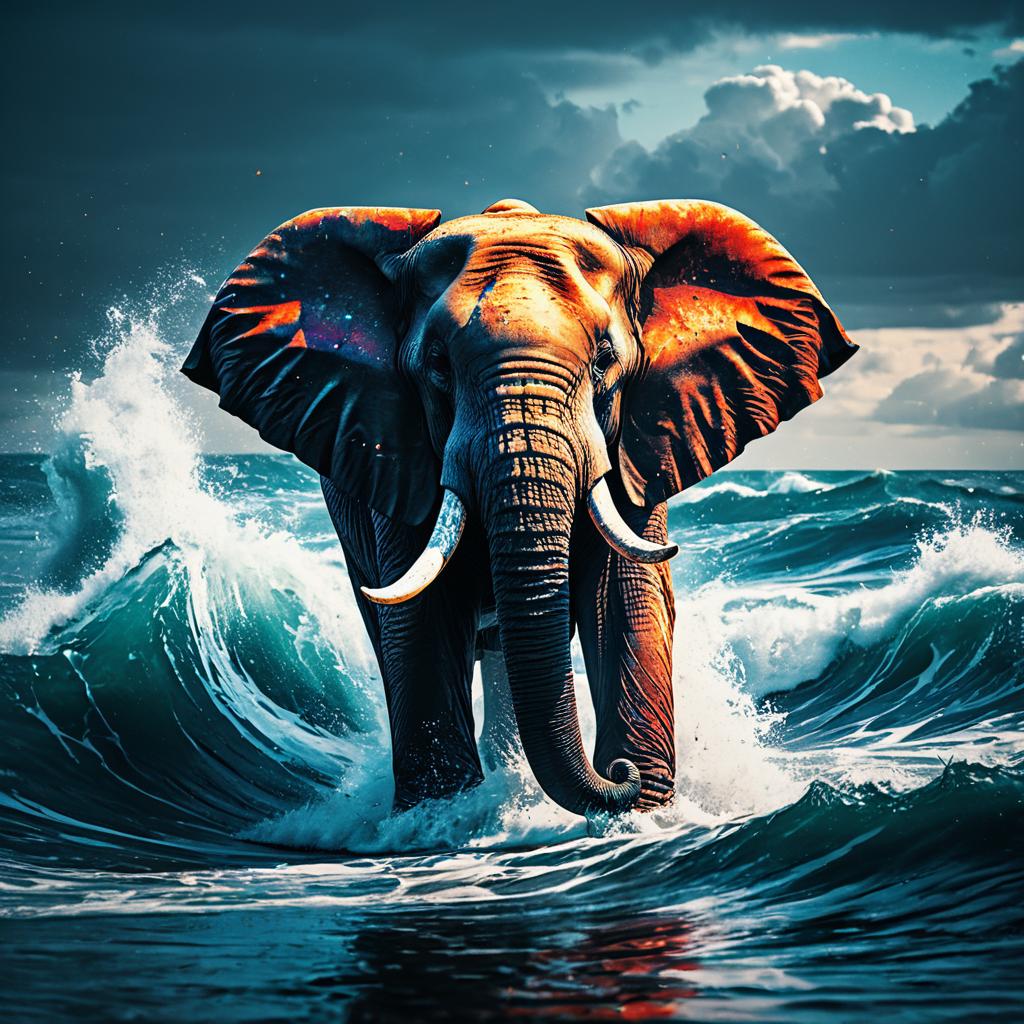 A surrealistic digital illustration of an elephant with tidal waves as ears, depicted with vibrant and intense colors. The image captures dynamic water motion with ultra-detailed lighting, creating a dreamlike and fantastical atmosphere. The elephant stands amidst a turbulent ocean under a colorful, moody sky.