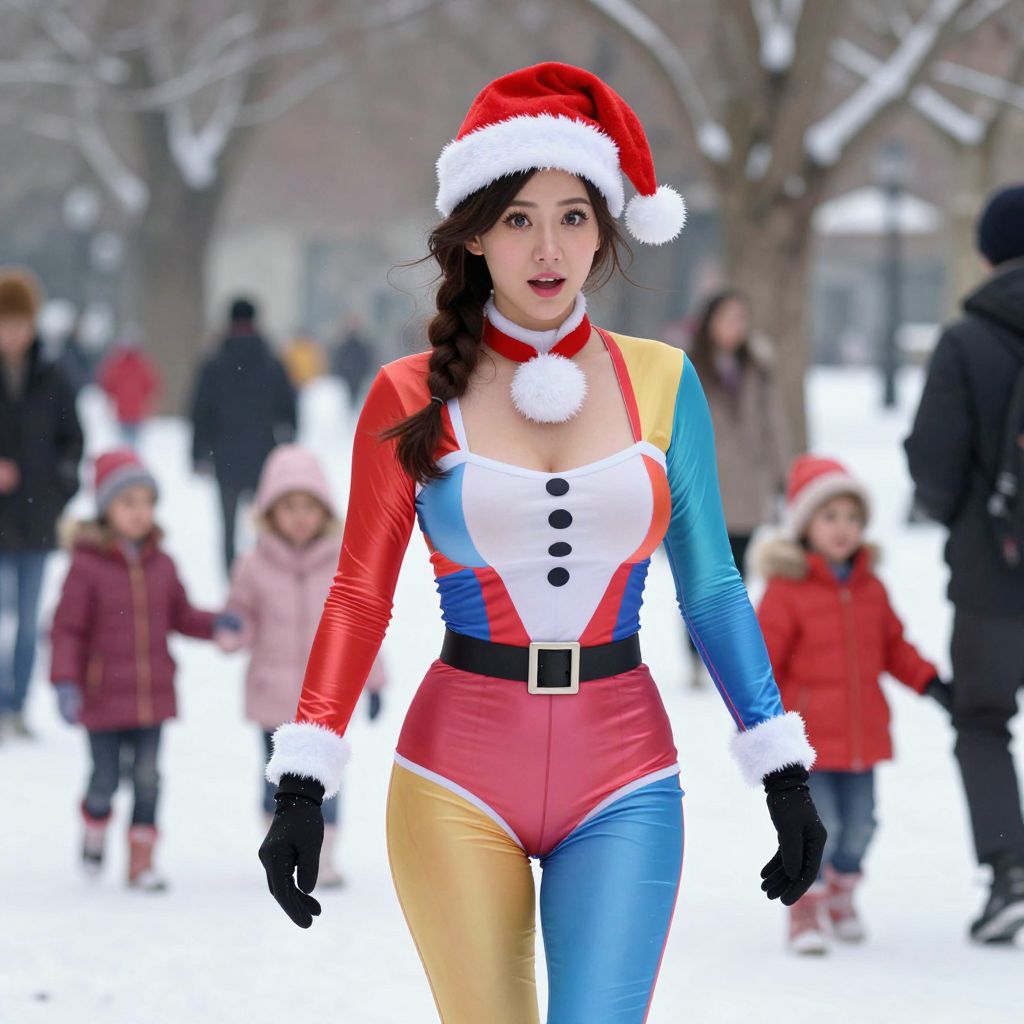 Photograph of an Asian woman with fair skin and long black hair wearing a Santa hat, red and white bodysuit with blue and yellow sections, black gloves, and a black belt with a square buckle. The bodysuit is form-fitting, accentuating her hourglass figure and medium-sized breasts. She stands in a snowy park with blurred background featuring children in winter clothes, bare trees, and adults dressed in dark winter jackets. The image has a high-contrast, slightly surreal style, emphasizing the vibrant colors of her outfit against the wintry, muted background.