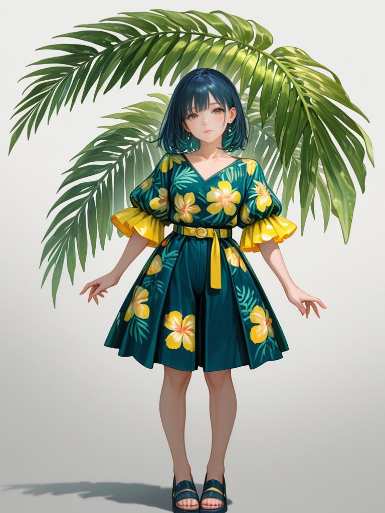 1girl, realistic face, full body shot, Woman, tropical print, short V-neck playsuit in dark blue with green palm leaf and yellow fruit motifs, short flutter sleeves, cinched waist with tie belt, pleated shorts, studio background with white backdrop.