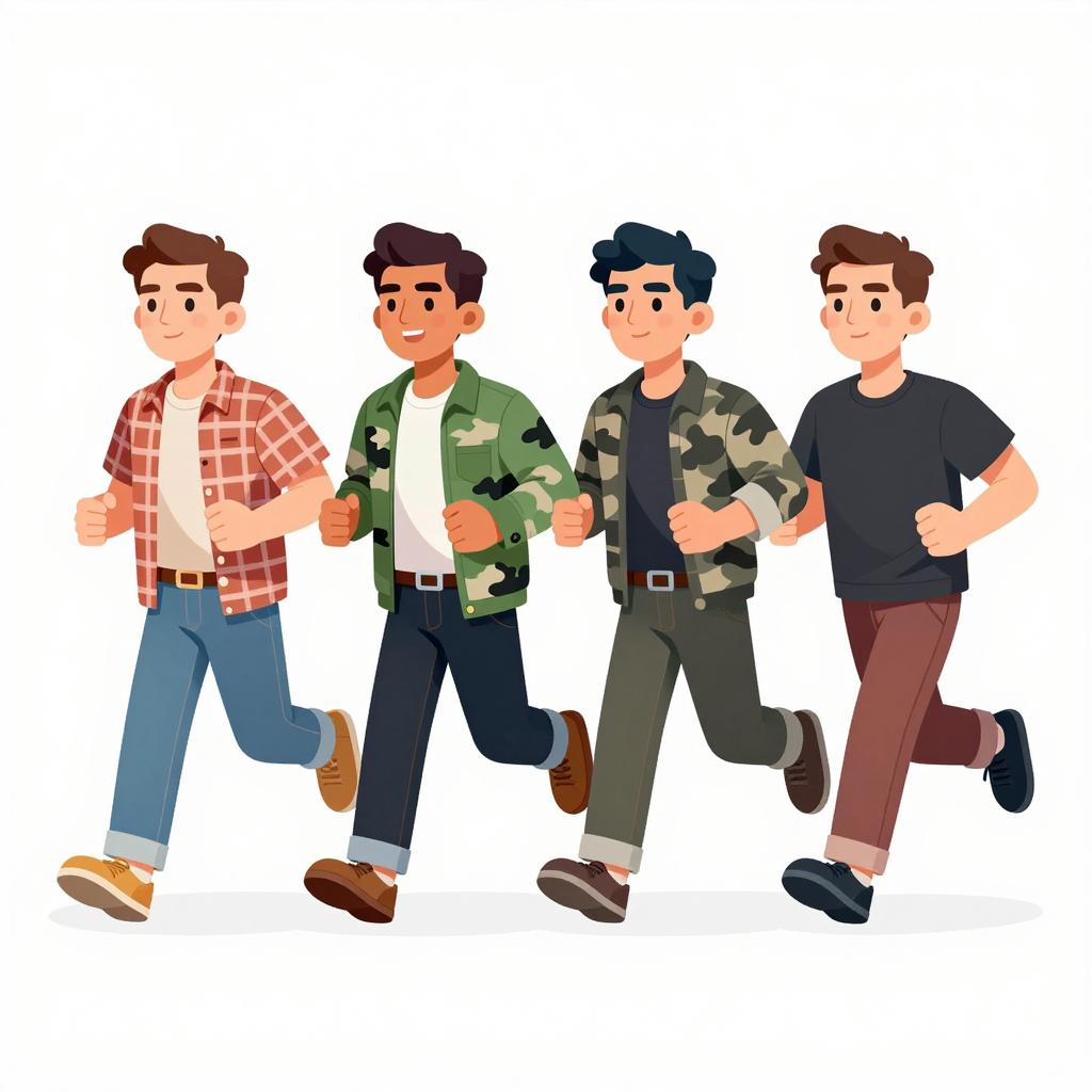 Illustration of four cartoon-style men running. Each wears different clothes: plaid shirt, blue jeans, green camo jacket, black shirt. Facial expressions show determination. Hands clenched, feet mid-stride. Background white, no additional objects. Artist "CB" in bottom right.