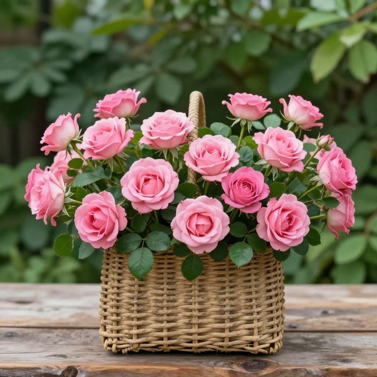 Woven basket brimming with vibrant pink roses and lush green foliage rests gracefully on a rustic wooden surface, set against a blurred backdrop of verdant foliage.