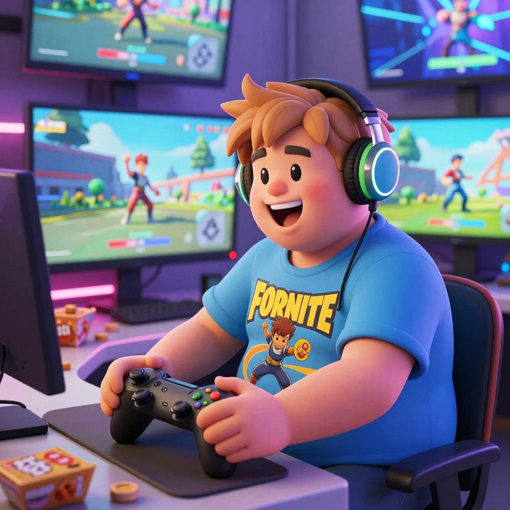 Fat Fortnite kid, excited and focused, mid-action playing on a console, bright and immersive gaming setup with multiple screens, LED lights, and snacks around, dressed in a graphic tee and headphones, cartoon style with bold colors and lively details.
