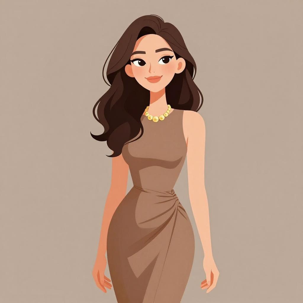 Woman with pretty face and pretty hair. smiling Woman, chic, fitted sleeveless dress in earthy brown hue, knee-length, ruched front with twisted detail at waist, round neckline, paired with a statement gold necklace, no visible sleeves. --sref 1467