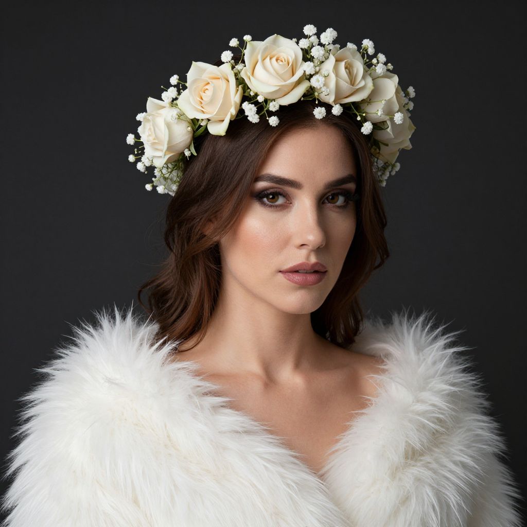 Elegant floral crown adorns a woman's head, featuring a delicate arrangement of cream-colored roses and baby's breath, complemented by a luxurious white fur stole draped around her shoulders against a dark background.