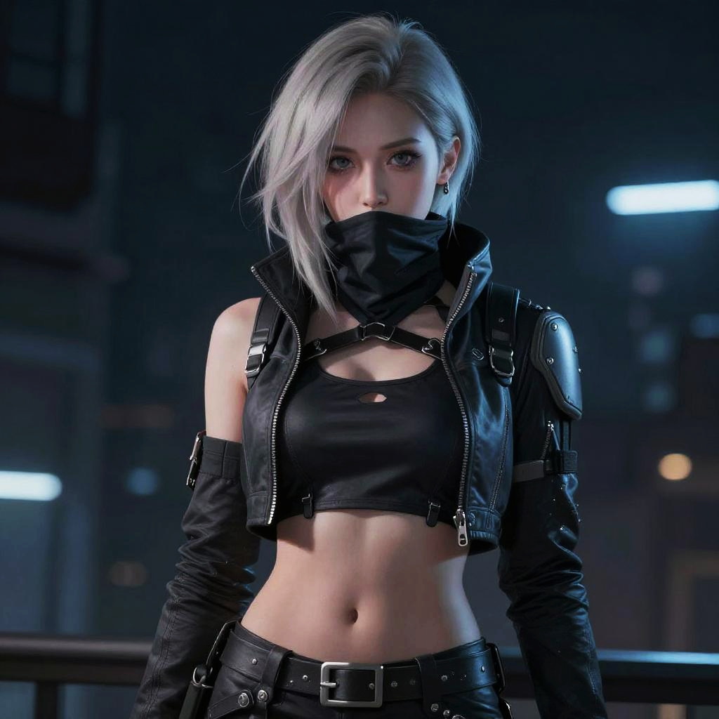 Realistic photo.Cyberpunk femme fatale, sleek black leather outfit with intricate straps, shaved silver hair, crimson eyes, freckled fawn skin and dark cherry lips. Dimly lit industrial setting with soft glowing light through bars. Emphasis on dramatic lighting, sharp contrasts, and cinematic aesthetics. realistic photo