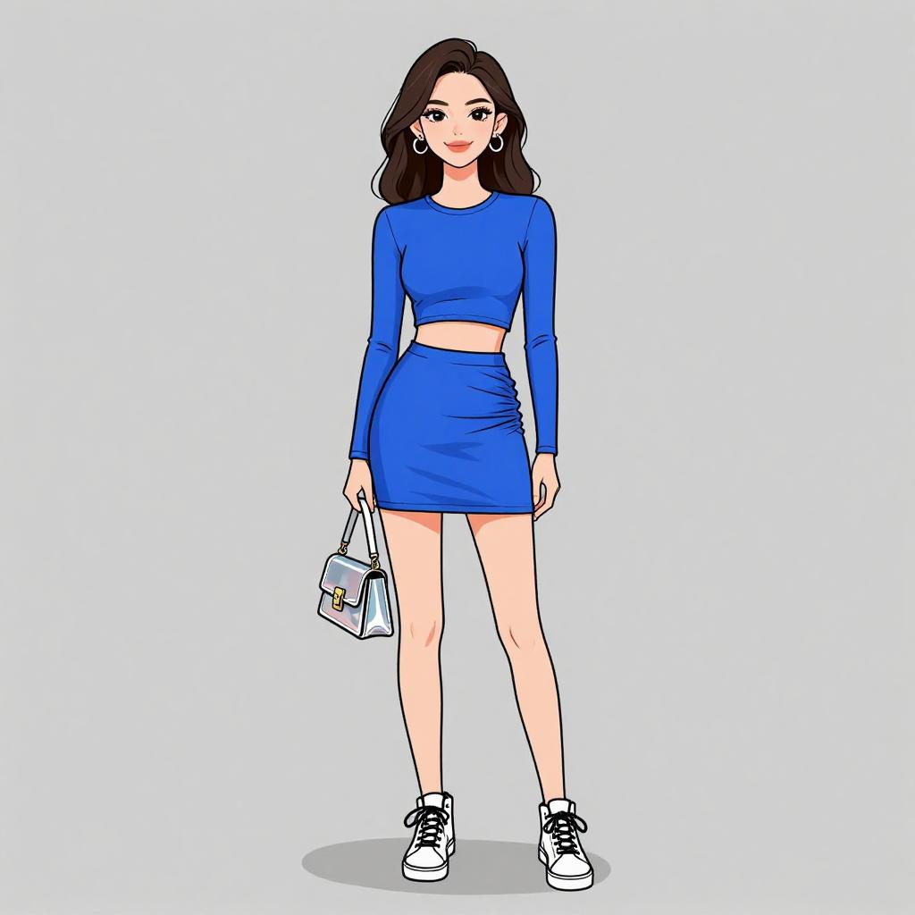 Digital drawing of a young woman with light skin and long, wavy dark brown hair. She wears a bright blue, long-sleeved crop top and matching blue mini skirt, revealing her midriff. She has small, white hoop earrings and is smiling with red lipstick. She holds a white shopping bag in her right hand and wears black and white sneakers. The background is plain white, making her blue outfit stand out. The style is cartoonish with bold, solid colors and clean lines.