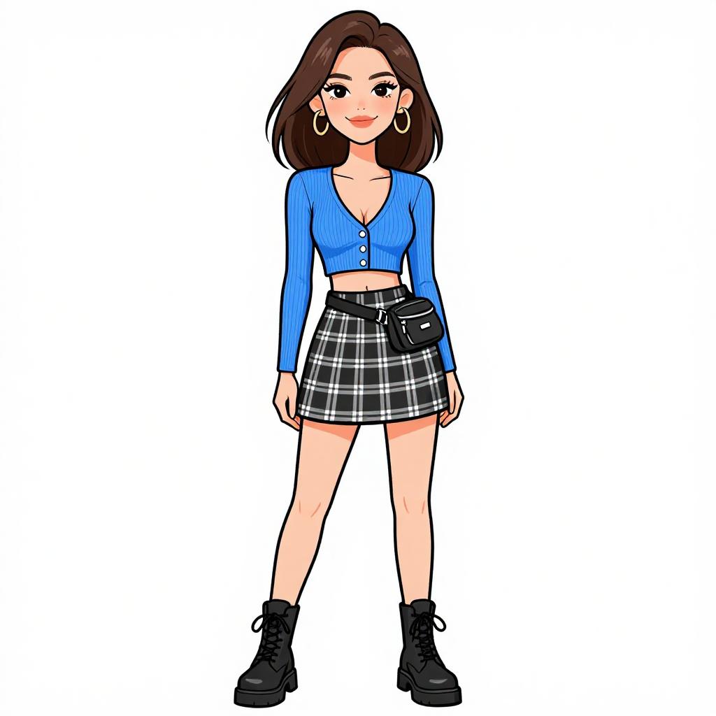 Digital illustration of a smiling woman with wavy brown hair, wearing a blue crop top and matching skirt, holding a shopping bag, and black sneakers,