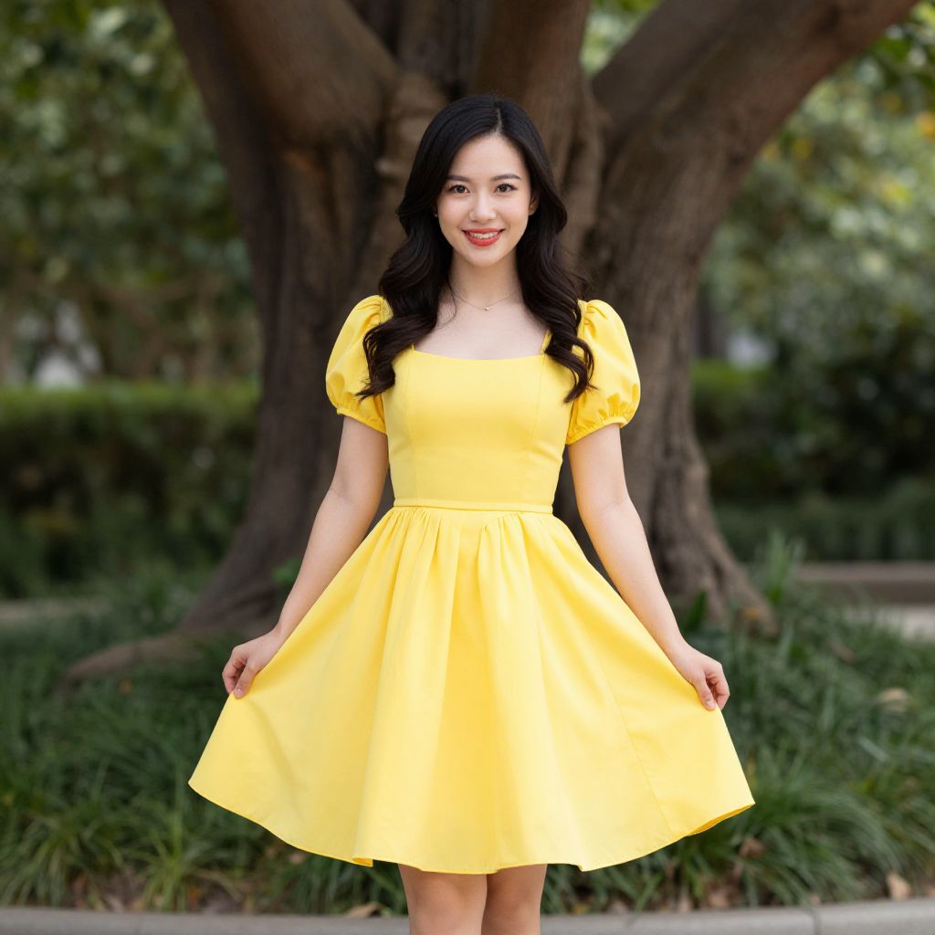 "Yellow Disney Dress, a woman in a yellow dress standing in front of a tree"