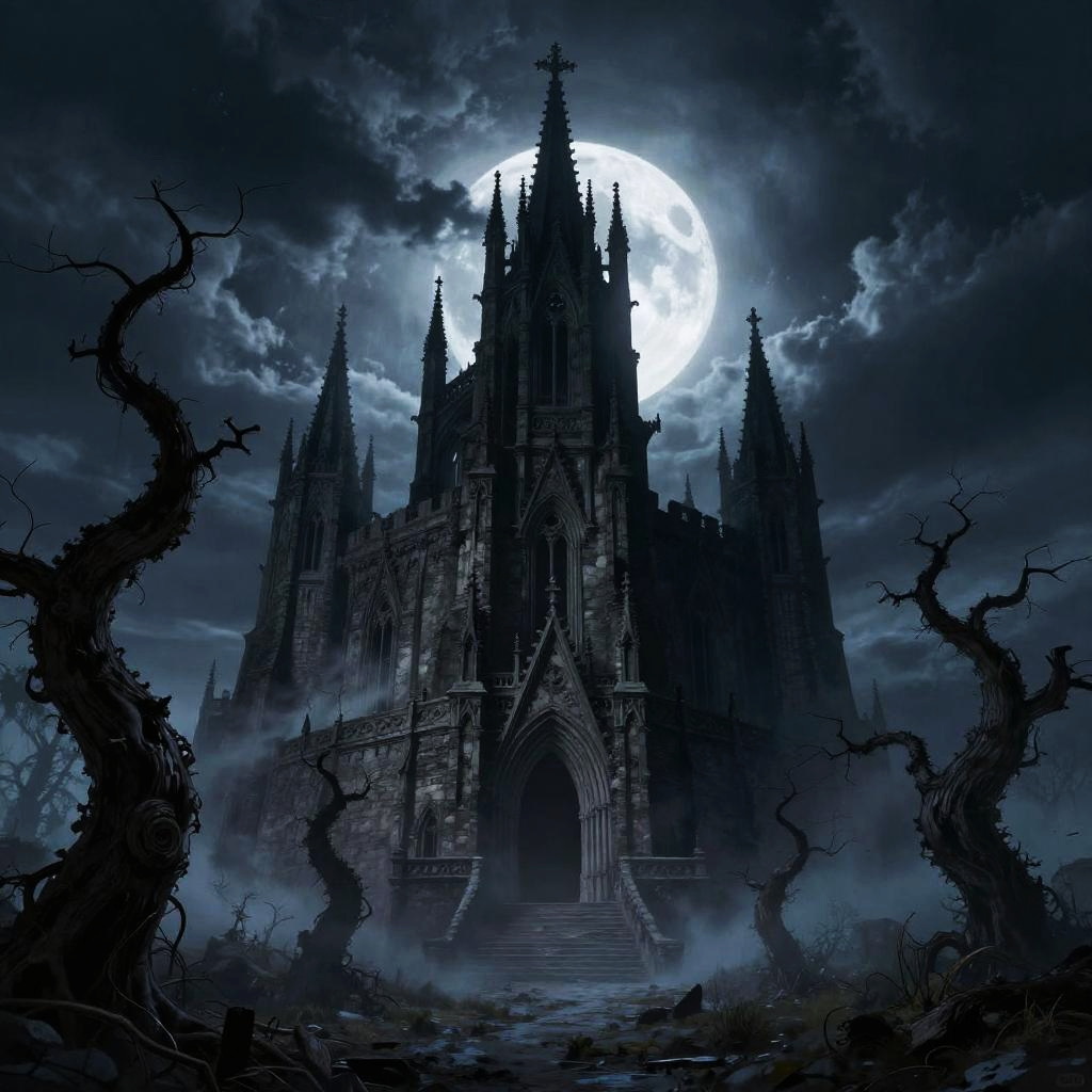 Dark castle art, towering gothic fortress under a stormy night sky, illuminated by eerie blue moonlight, surrounded by twisted dead trees and swirling mist, in a dramatic fantasy style