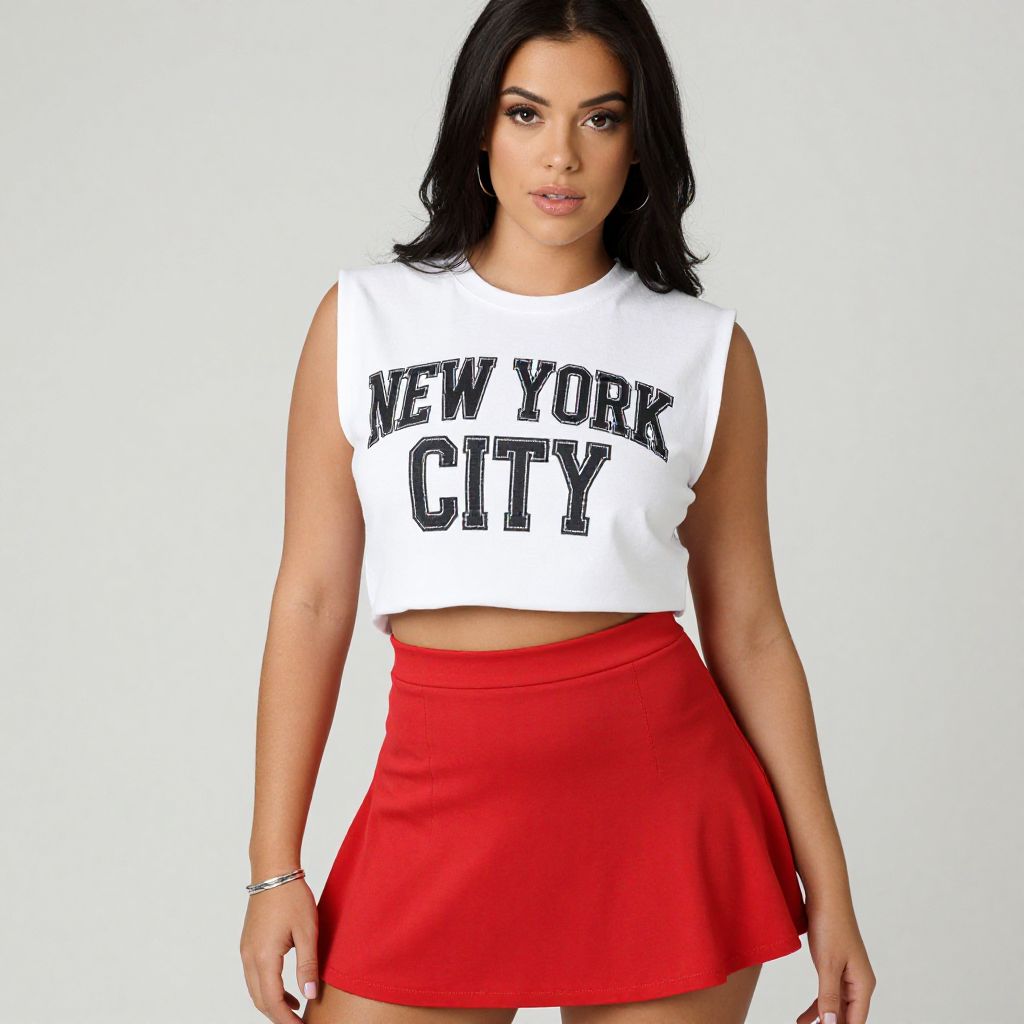 "Woman, casual street style, white sleeveless graphic crop top with "NEW YORK CITY" print, crew neck, bright red skater skirt, flared and knee-length, silver bangle on one wrist, studio background with a white backdrop.. Sexy. Pretty face and beаutiful eyes. Big breasts."