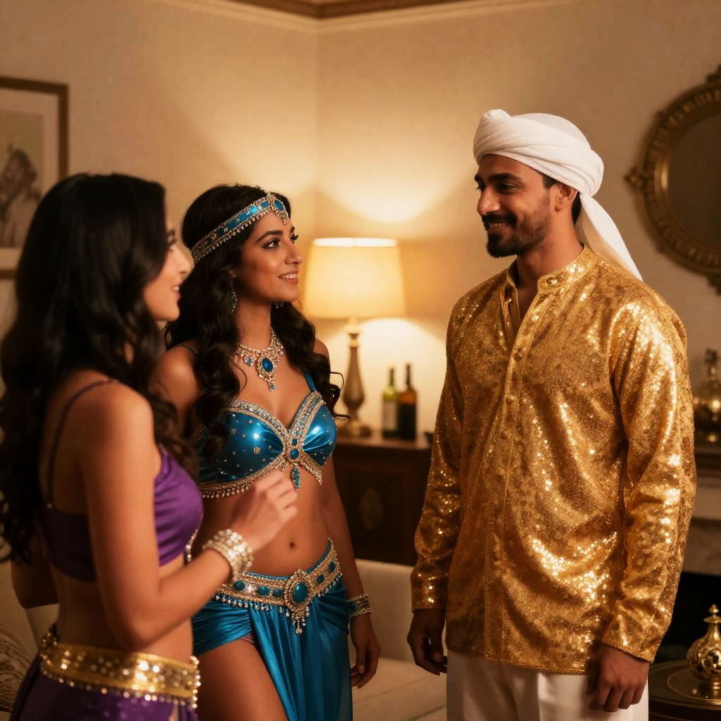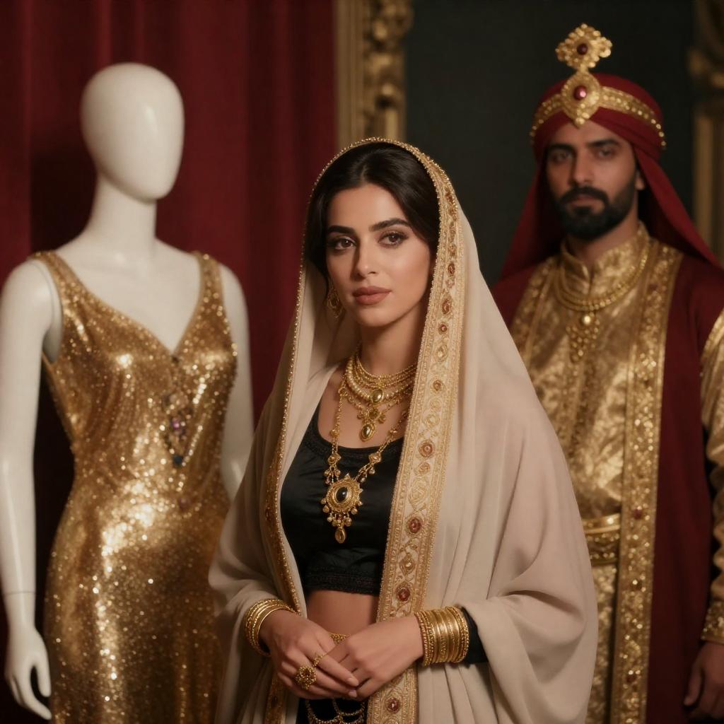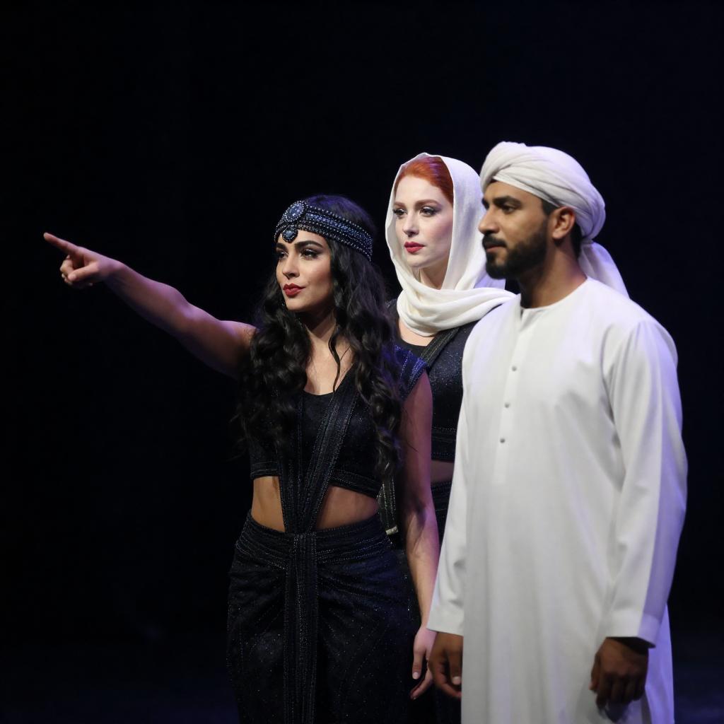 Photograph of three performers on stage. A woman with long black hair and a beaded headpiece points to the left, wearing a dark, sparkly outfit. A red-haired woman with a white headscarf stands behind her, and a man in a white turban is in front. Dark background.