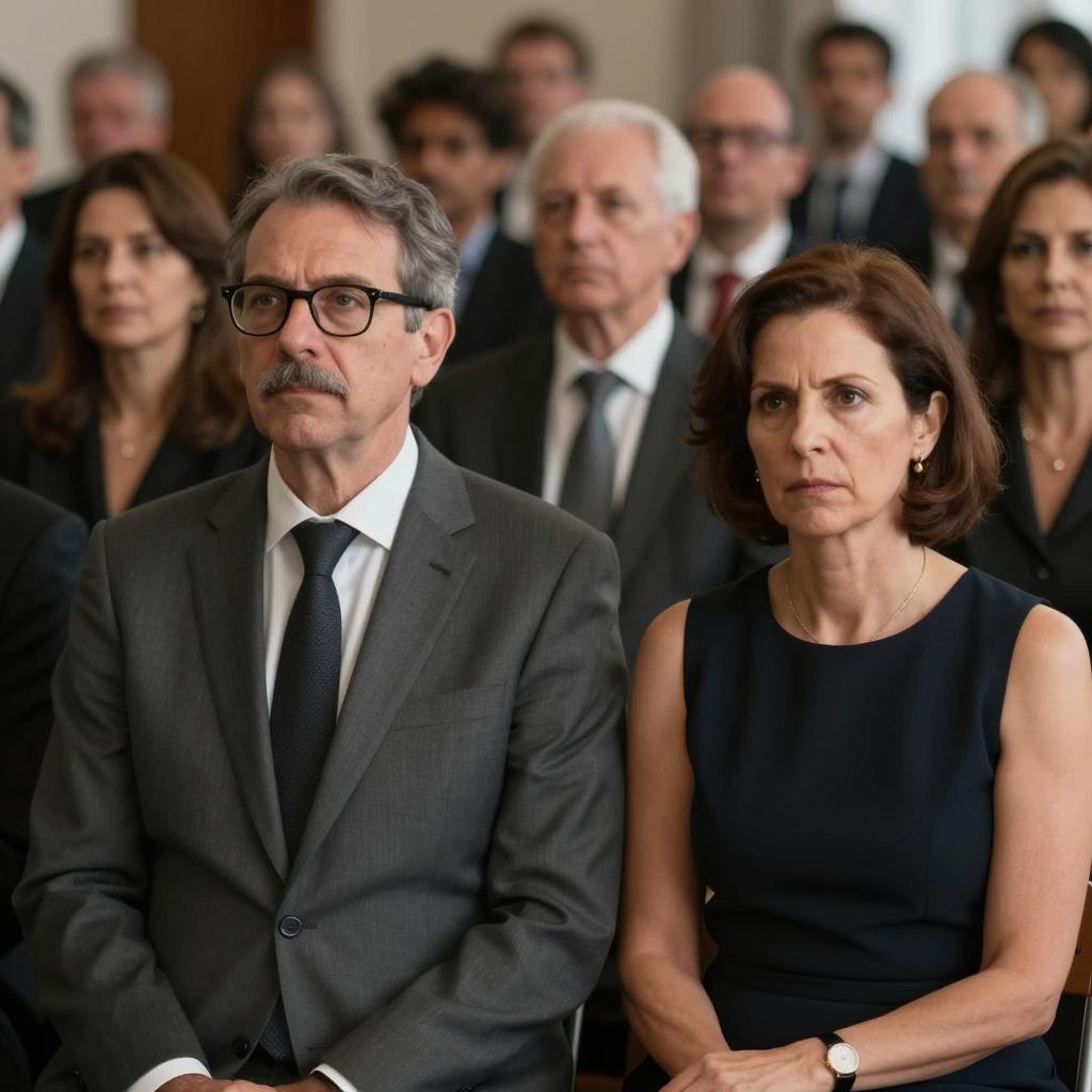 A group of middle-aged adults attending a formal event in a dimly lit room. In the foreground, a man with gray hair, glasses, and a mustache is wearing a gray suit with a white shirt and black tie. Next to him, a woman with short brown hair is dressed in a dark sleeveless dress, displaying a serious expression. The background features multiple people in formal attire, with blurred faces to emphasize the two main subjects. The composition is slightly off-center, highlighting the man's left arm positioned slightly in front of the woman.