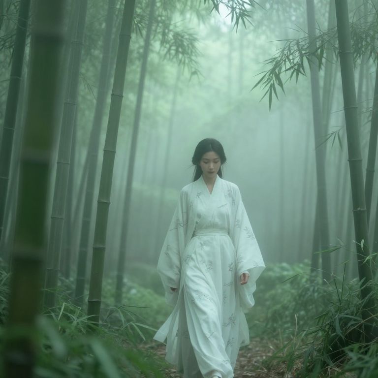 Minori, a young woman walking through a lush green rice field, traditional Japanese attire fluttering, soft sunlight filtering through misty morning air, mountains in background, intricate details in fabric and nature, painterly yet realistic approach.