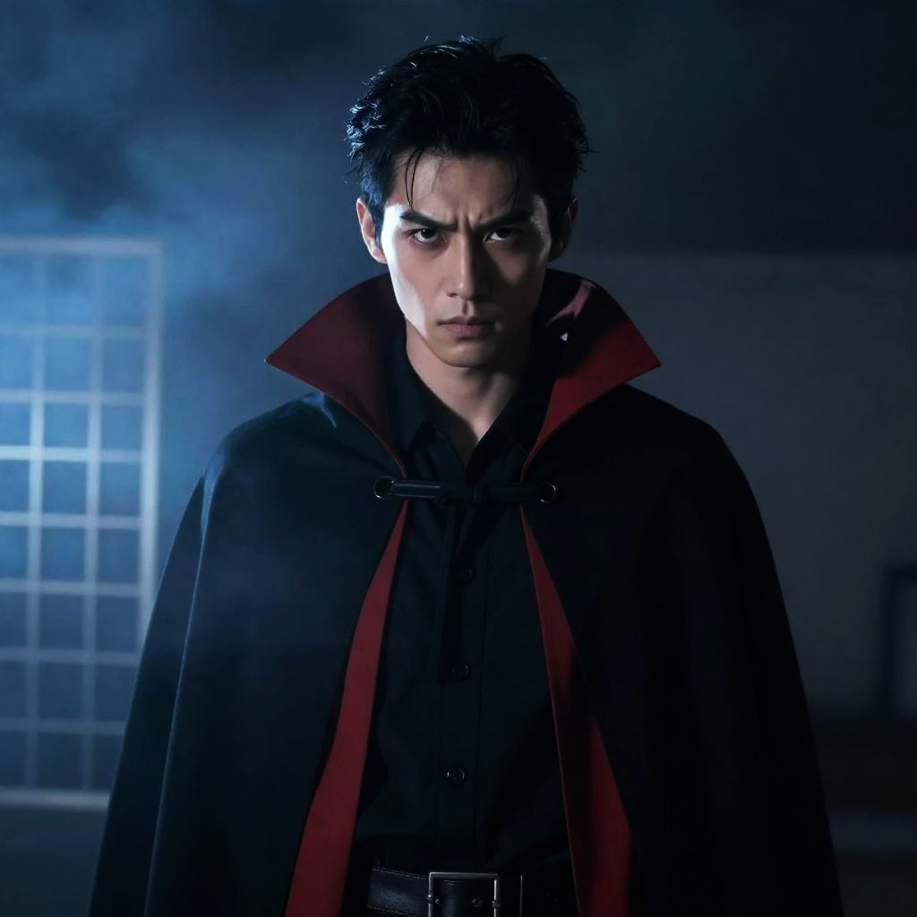 Dark-haired man with intense expression, wearing black and red high-collared cloak, surrounded by blue smoke. Light grid on left. Low-light setting, dim background.