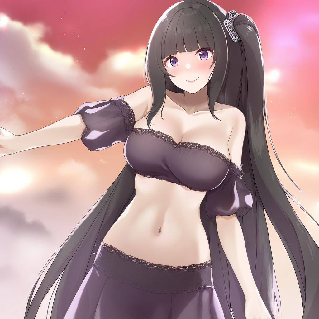 Architect (girls' frontline), girls' frontline, 1girl, pink eyes, purple eyes, black hair, very long hair, side ponytail, hair ornament, medium breasts, large breasts, cleavage, navel, collarbone, bare shoulders, pink nails, nail polish, one side up, by artist mk (mod0), leet