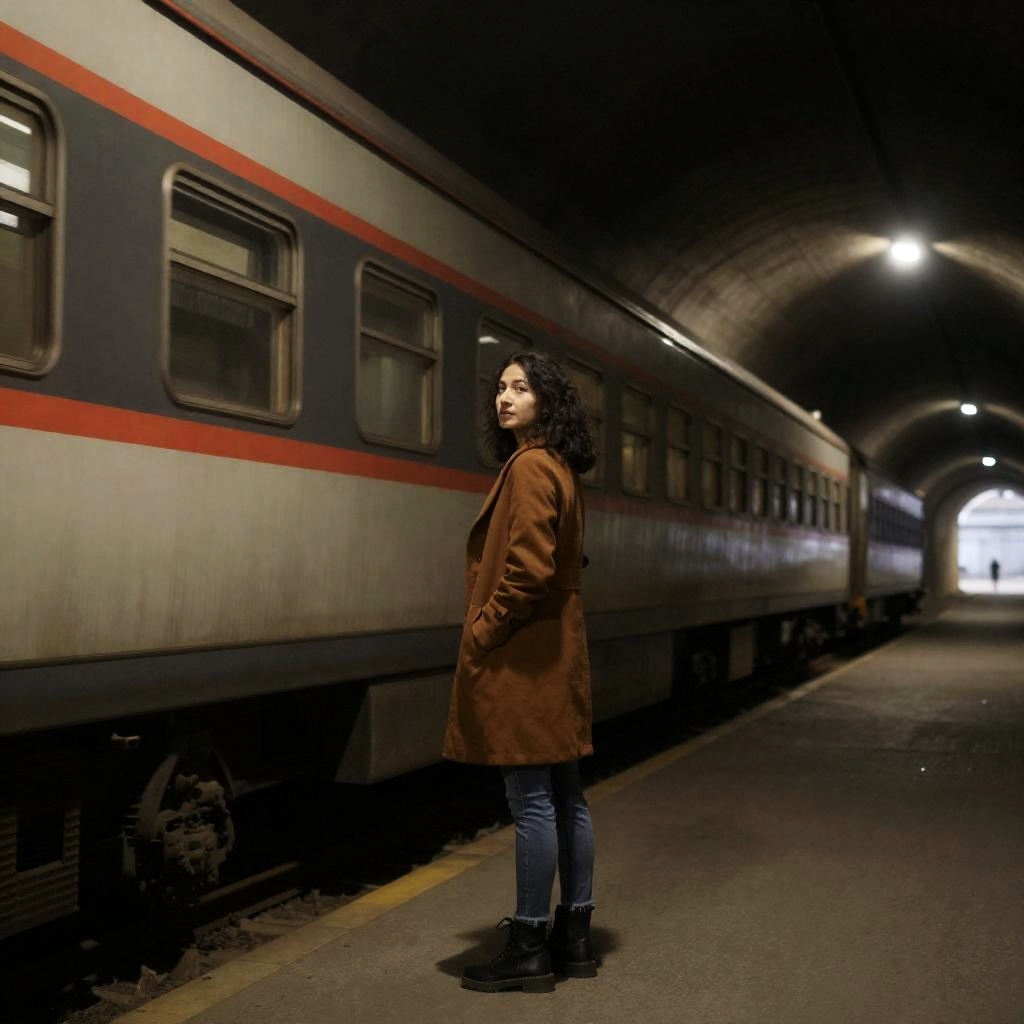 Photograph of a man in a dark suit standing beside a bicycle, facing a speeding train emitting white smoke. The train is on the left, with the man on the right. Blue twilight sky. Train and train tracks in background. Man has short dark hair, neutral expression. Bicycle has black frame and seat. Train engine lights are visible. Background includes a building with a gabled roof.