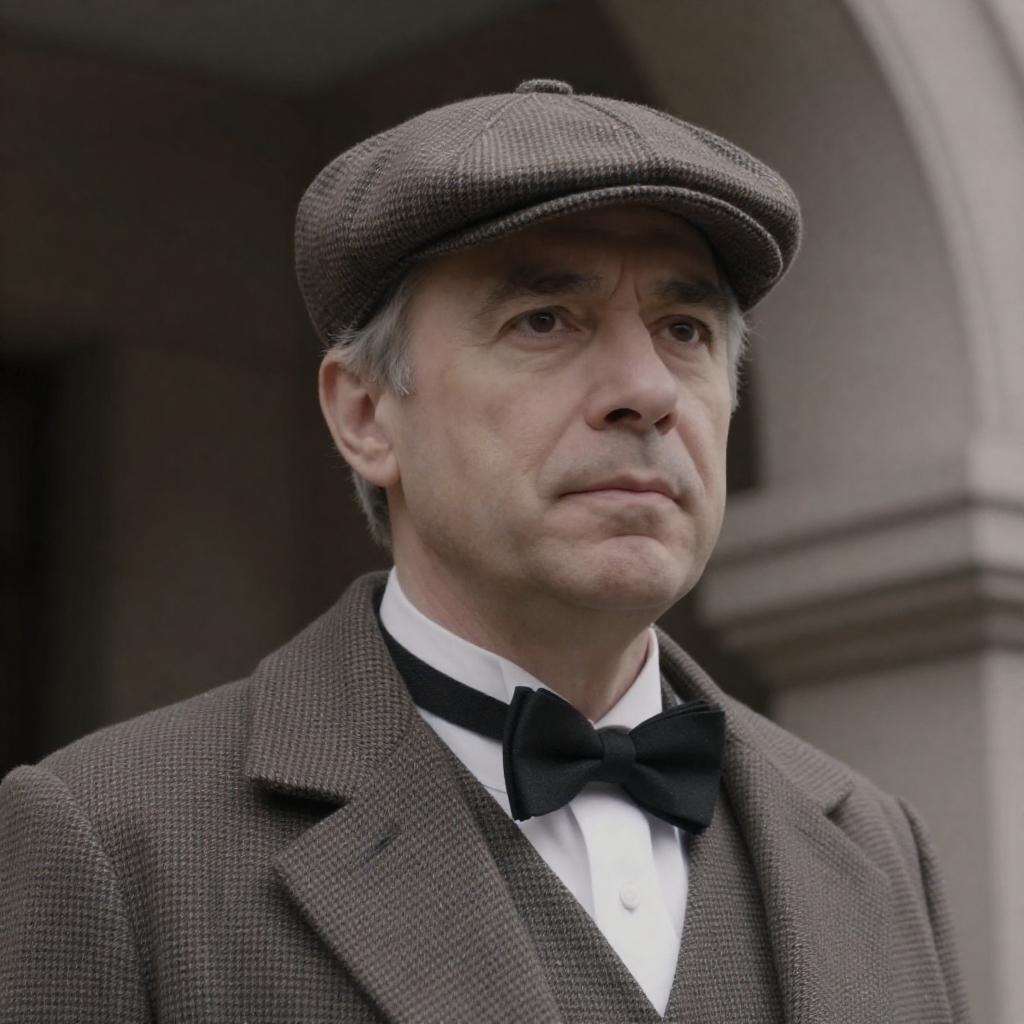 Middle-aged man with light skin, grey hair, wearing brown checkered flat cap and matching coat, black bow tie. Background shows architectural beams. Man's face slightly upturned, expression neutral. Close-up shot.