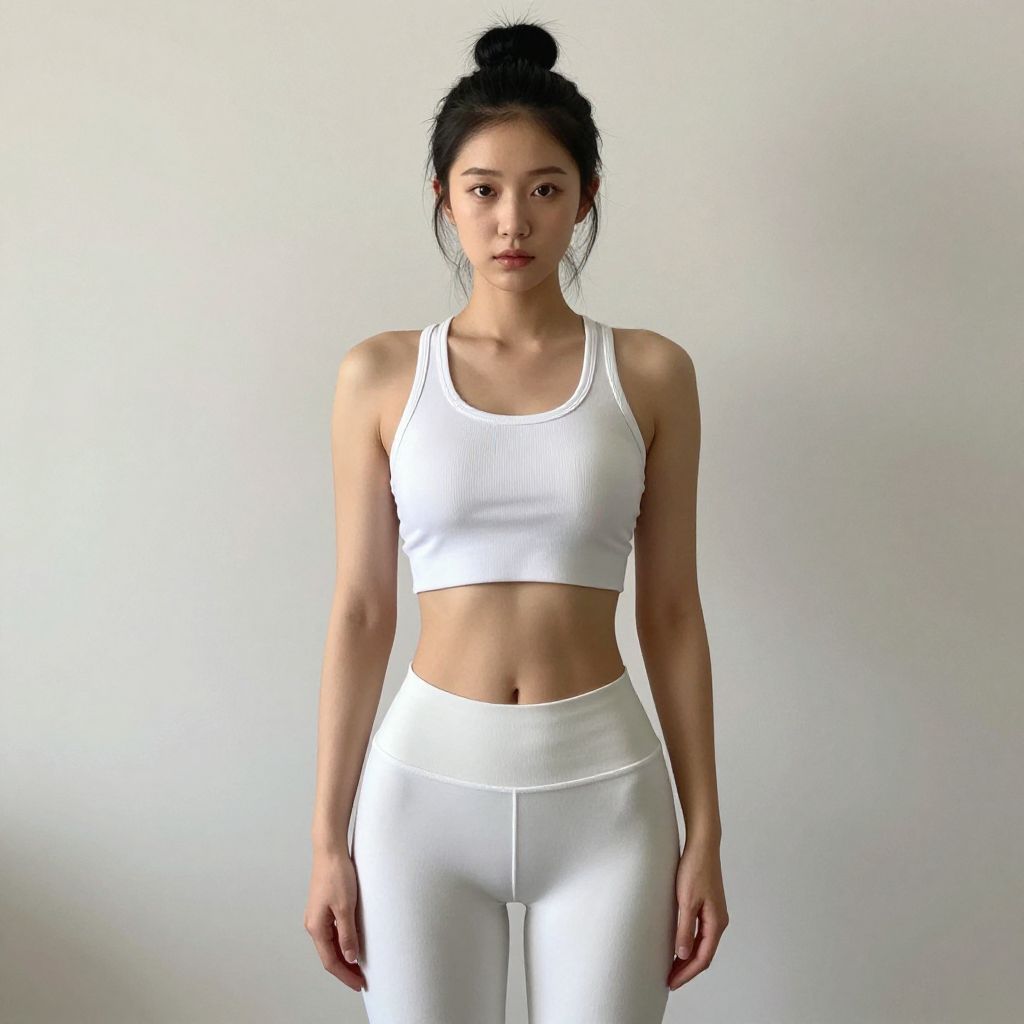 Photograph of an East Asian woman with black hair in a bun, wearing a white sports bra and high-waisted leggings, standing against a plain