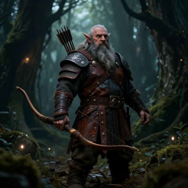 Photorealistic digital artwork of an elderly, gray-bearded elf archer in dark, medieval armor, holding a bow in a misty forest.