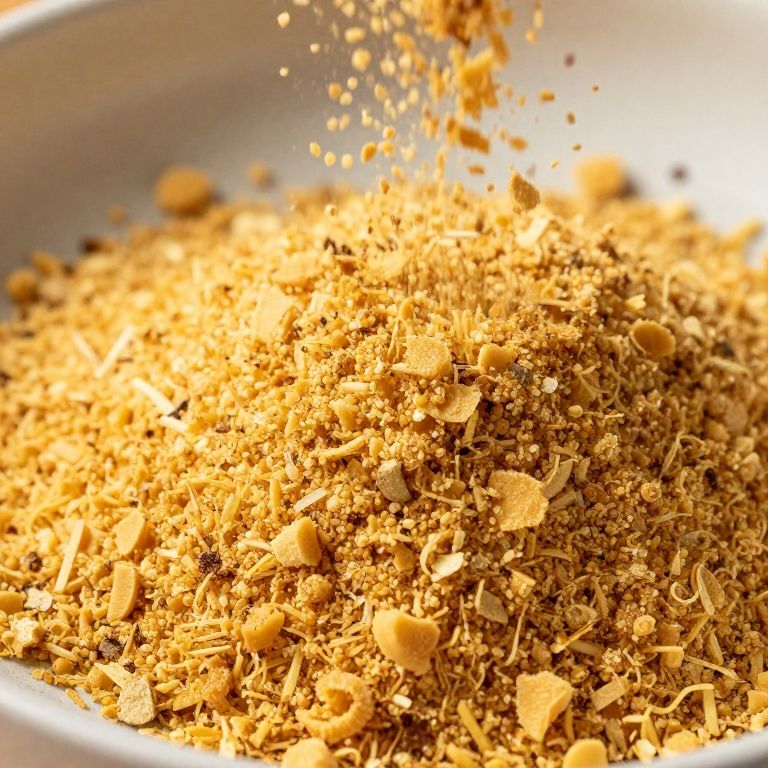 Close-up photograph of a metal bowl filled with golden-brown granulated spices and small pieces of dried fruit. The spices are finely ground, with visible textures of flakes and tiny fragments. A small amount of the spice mixture is being sprinkled from above, creating a dynamic sense of movement. The bowl is slightly out of focus in the background, emphasizing the detailed texture of the spices in the foreground. The lighting is bright and natural, highlighting the warm, golden hues of the mixture.