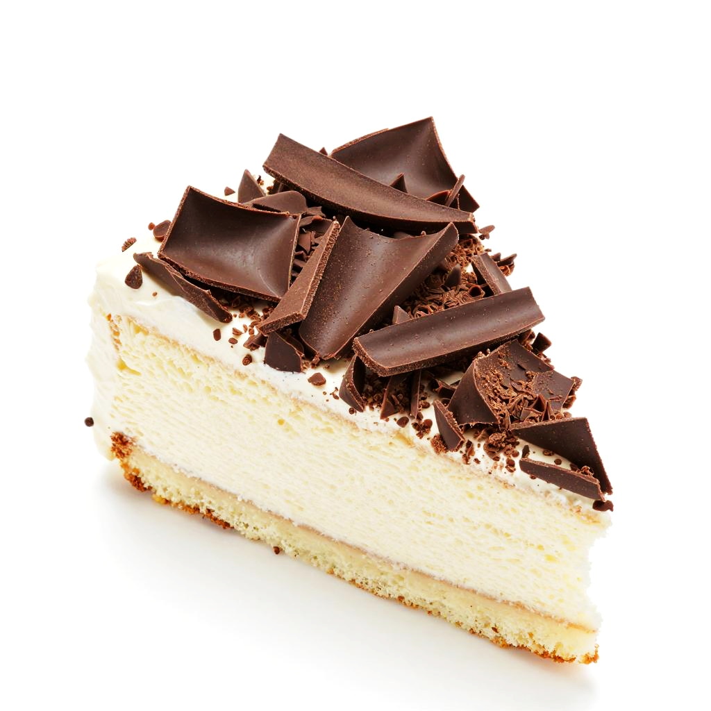 Photograph of a triangular slice of white cake with a thick layer of rich, dark chocolate shavings on top. The chocolate shavings are scattered unevenly across the cake slice, creating a textured, rustic look. The background is completely white, making the cake and chocolate stand out sharply. The image has a high contrast, with the dark chocolate contrasting against the bright white cake and background.