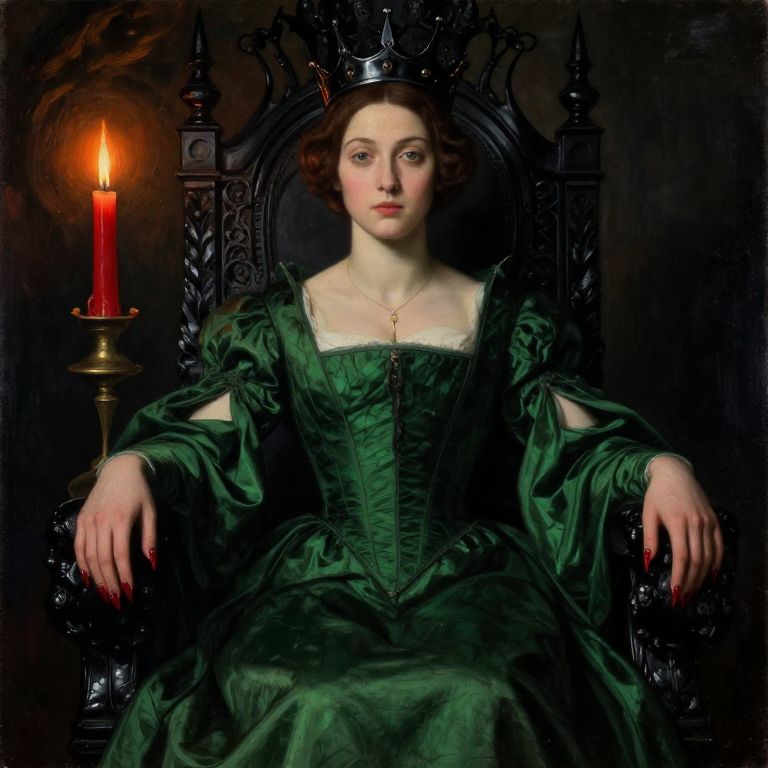 A photorealistic painting in pre-Raphaelite style depicting a beautiful queen seated on a stark black throne. She wears a dark green dress with a plunging neckline and has long, sharp fingernails painted red. The queen is adorned with a black iron crown and a key pendant necklace. Her serene expression contrasts with the dark, ornate background featuring a single tall red candle with an orange flickering flame on a brass holder.