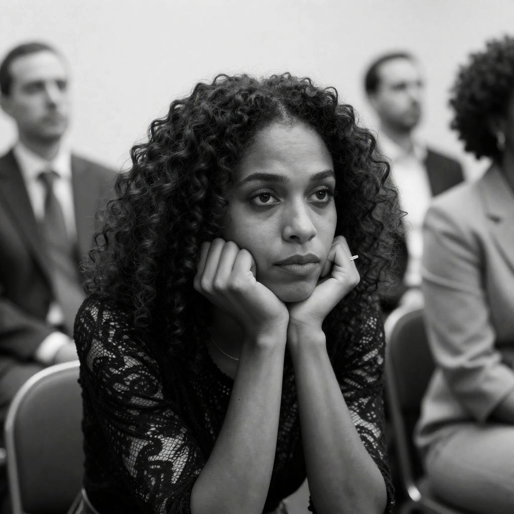 Photograph of a confident, dark-skinned woman with short, curly black hair, wearing a sleeveless, red and navy top. She stands with arms crossed, looking to the side. Blurred audience in the background, seated in rows. Overhead lights illuminate the scene.