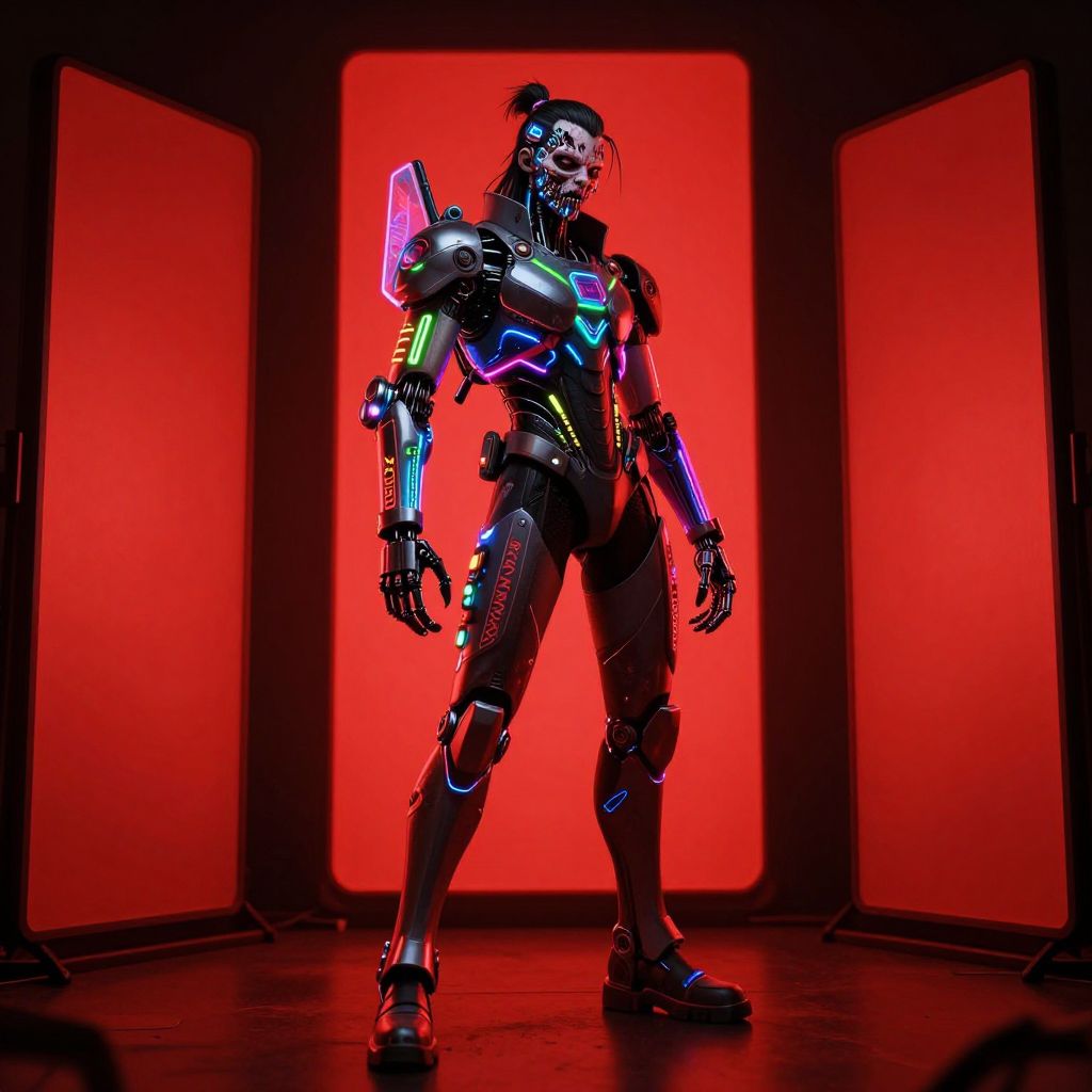 A cyberpunk anime-inspired digital illustration featuring a zombie-faced humanoid in a high-tech cyborg suit, The character’s decayed face has exposed metallic implants and pulsing LED lines that highlight its eerie look, His long hair is tied in a man bun, blending organic and mechanical aesthetics, The suit, sleek and armor-plated, is covered in glowing neon LED strips in vibrant green, blue, and pink, with colorful straps featuring Japanese kanji across his arms and legs, Reflective patches enhance the neon lights around him, while a pair of retractable pulse blasters sits on his forearms, and a holo-shield generator is mounted on his back, His tech-gloves have claw-like mechanical fingers, and cyber-enhanced boots emit a faint glow, Standing in a dark room, the figure is framed by three large, 7-foot-tall red rectangular lights—one directly behind, casting a dramatic glow, and two on either side, adding layered depth, The intense red lights mix with subtle neon reflections, bathing the character in an exaggerated red tint that amplifies his haunting yet advanced cyberpunk presence