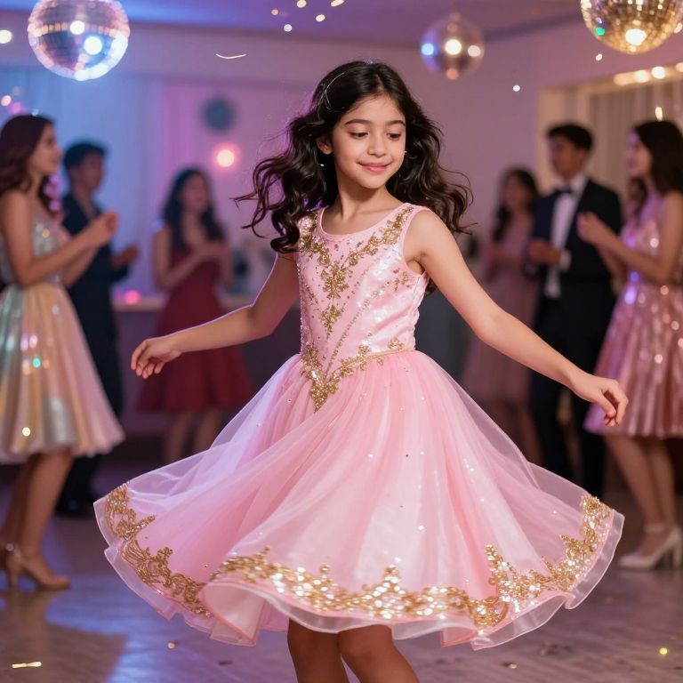 A girl with dark wavy hair and a soft smile wearing a sparkly pink birthday dress with a flowing hem and sparkling gold embroidery, dancing in a brightly lit party room with disco lights, confetti, and guests in various party outfits