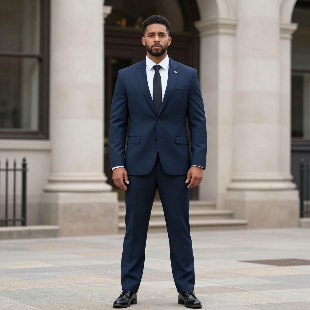 Photograph of a well-dressed Black man with a short, neatly trimmed beard and close-cropped hair, standing confidently in front of a classical building with white columns and arched windows. He wears a dark navy blue suit with a white dress shirt and black tie, and black polished shoes. His expression is serious and composed. The background includes a black iron fence on the left and the building's stone facade. The lighting is bright, highlighting his attire and the architectural details. The overall style is formal and professional.