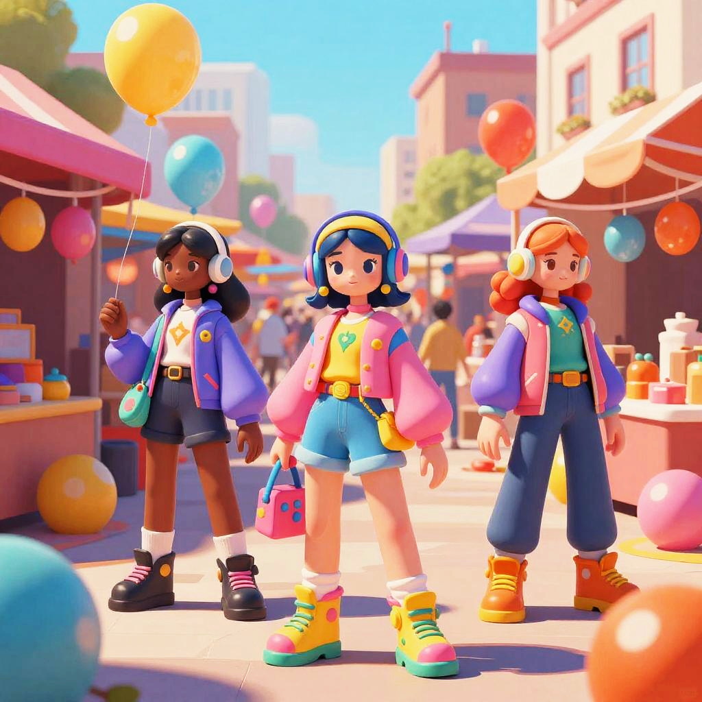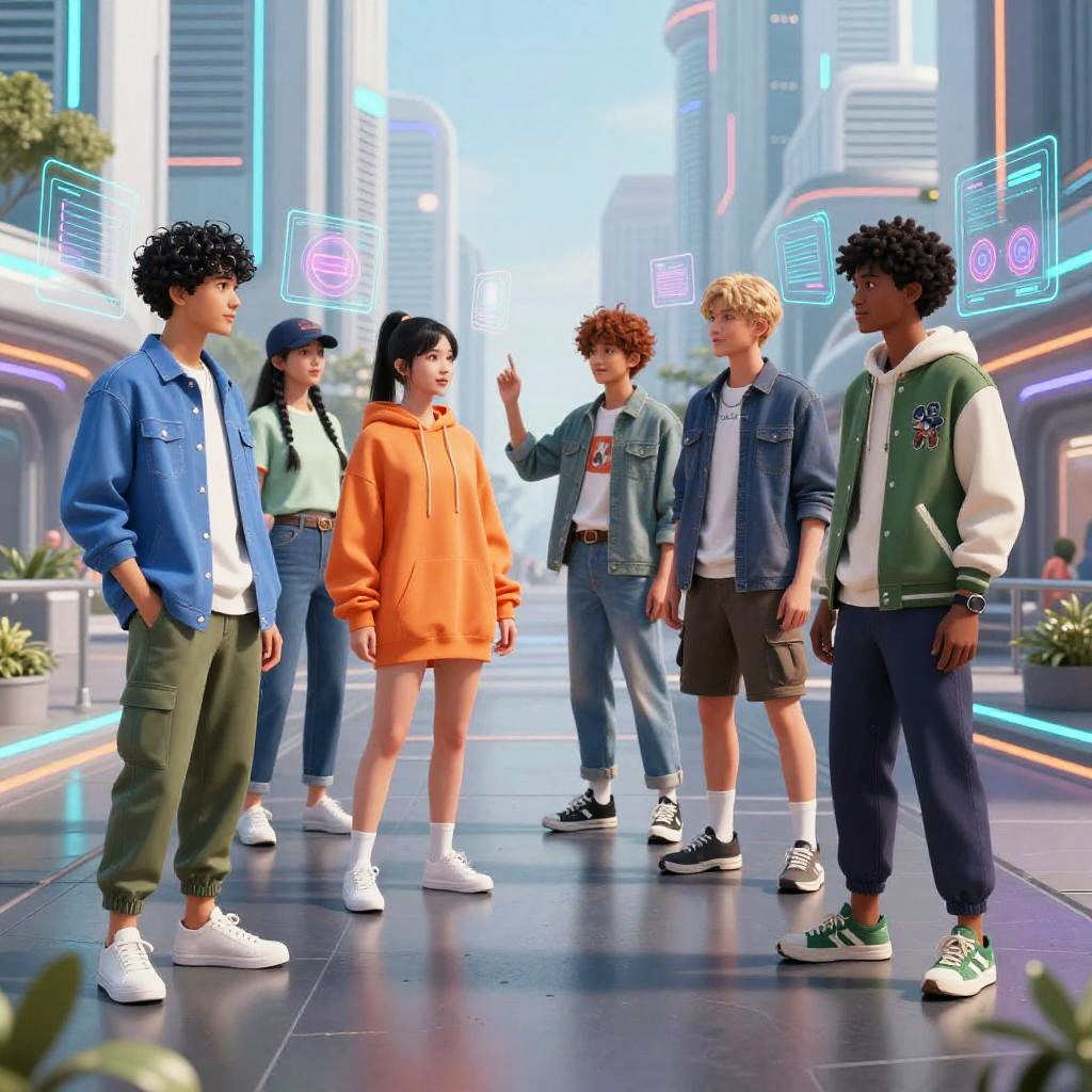 AI clothes swap scenario with diverse models in futuristic cityscape, garments morphing and interchanging instantly, holographic interfaces surrounding them, vivid colors with metallic textures, modern casual and streetwear styles, high detail, digital art