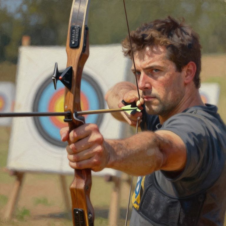 A hyper-realistic oil painting portrays a master archer's intense focus and determination as they prepare to shoot an arrow at a distant target from a 'bug's-eye view' perspective, akin to peering through the eye of the arrowhead itself. This captivating scene showcases intricate details such as the weathered wooden shaft, perfectly sanded nocks, and razor-sharp metal tip that glimmers in warm sunlight. As the archer locks their gaze onto an unseen goal, their features convey a profound sense of concentration and unwavering resolve, drawing viewers into an emotional journey beyond the physical act of shooting. This powerful image evokes both serenity and anticipation, inviting audiences to reflect on focus's transformative power and dedication when pursuing one's goals.