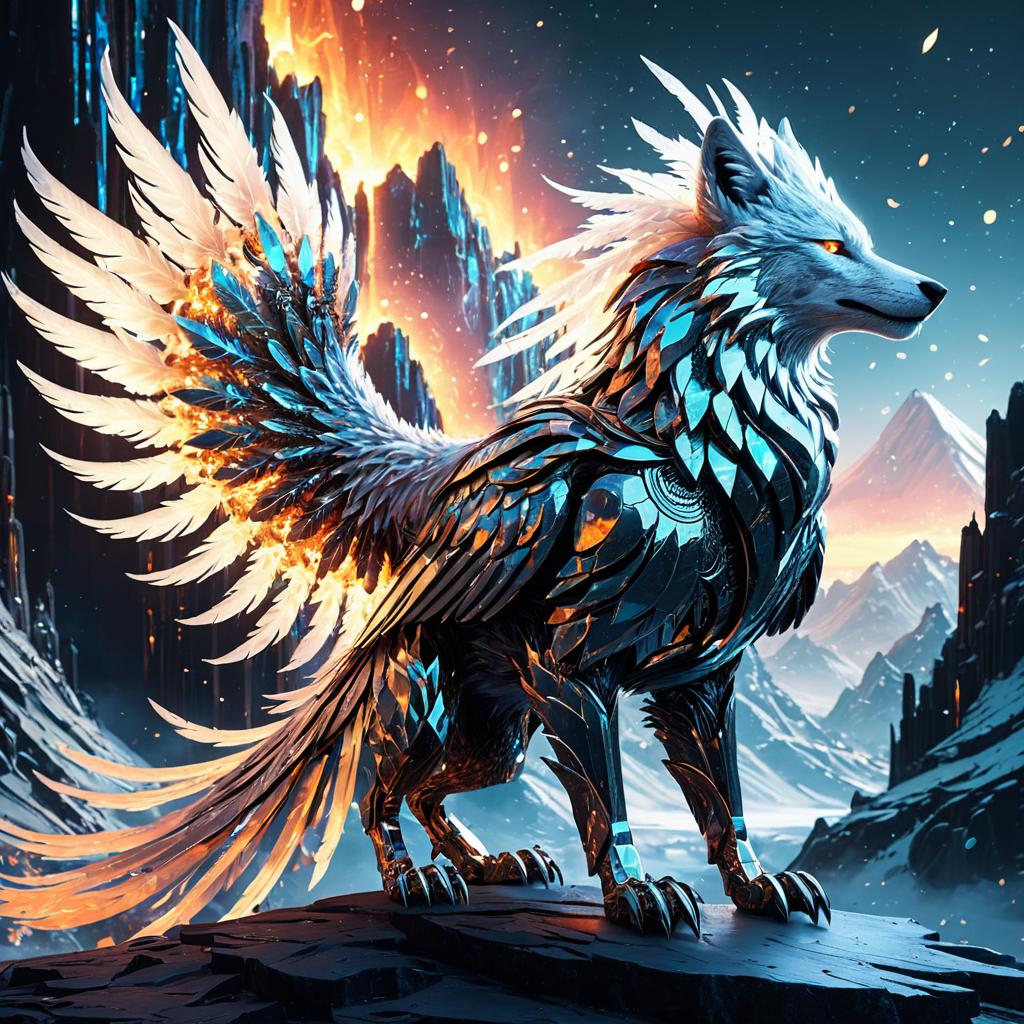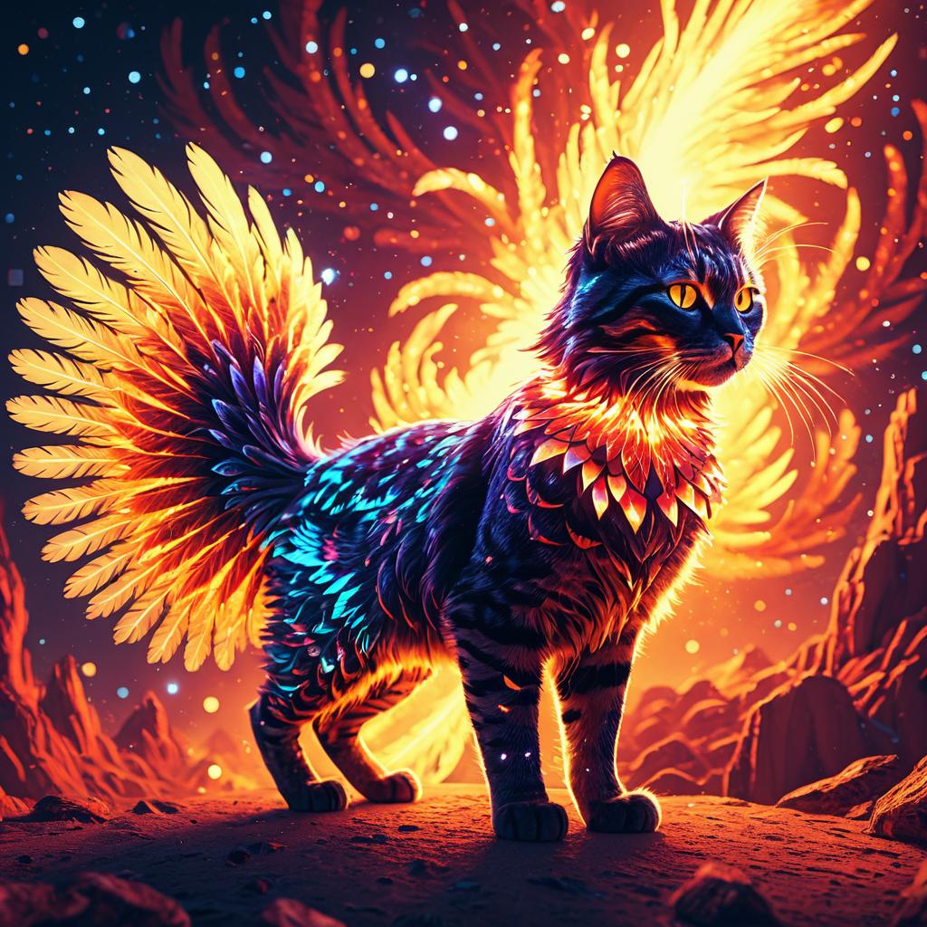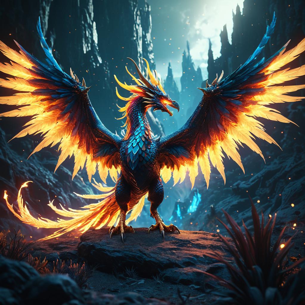 Radiant Phoenix-Fish Hybrid in Surreal Landscape