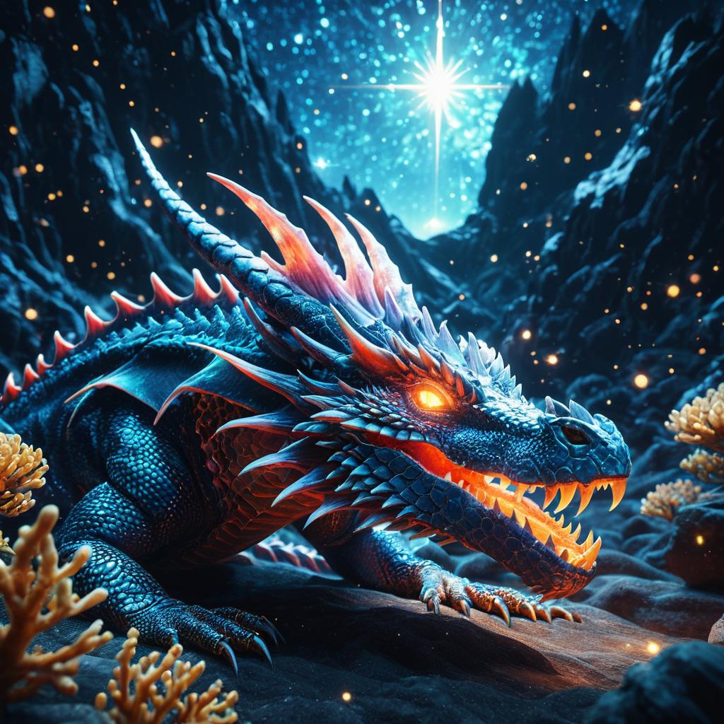 A radiant luminescent phoenix-fish hybrid featuring glowing orange feather fins and turquoise scales, emitting nebula-like sparks. The fish drifts over a rocky, alien terrain under a dark starry sky illuminated with soft volumetric lighting, creating a surreal and dreamlike atmosphere. Highly detailed 8K resolution digital art inspired by fantasy and sci-fi themes.