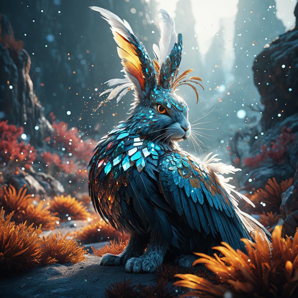 Radiant luminescent phoenix-fish hybrid adorned with glowing feather fins emitting nebula-like sparks, drifting in a dreamlike surreal landscape, soft volumetric lighting, 8K resolution, trending on ArtStation, hyper-detailed Unreal Engine render, by Aaron Griffin. ar 9:16