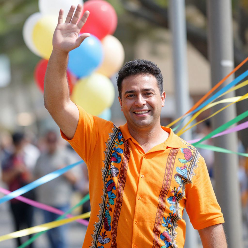 A vibrant photograph of a smiling, dark-haired man with medium skin, wearing an orange shirt adorned with colorful patterns. He's waving enthusiastically with a bright, cheerful expression. The background is blurry with colorful balloons and a sunny outdoor setting. The man is surrounded by swirling, multicolored ribbons that add a dynamic, festive feel to the image.