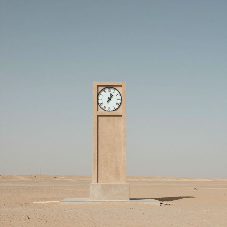 Photograph of a tall, rectangular clock standing alone in a vast, barren desert. The clock has a white face with black numerals and hands, and is mounted on a beige concrete pedestal with a square base. The sky above is clear and blue, with no clouds. The sandy desert stretches out in all directions, with distant, faintly visible dunes on the horizon. The clock casts a small shadow on the ground, indicating bright sunlight. The overall scene is minimalist and stark, emphasizing the isolation and simplicity of the desert landscape.