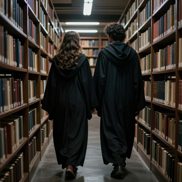Two figures in dark, flowing robes walk hand-in-hand through a dimly lit library aisle, surrounded by shelves filled with neatly arranged books under the glow of fluorescent lights.