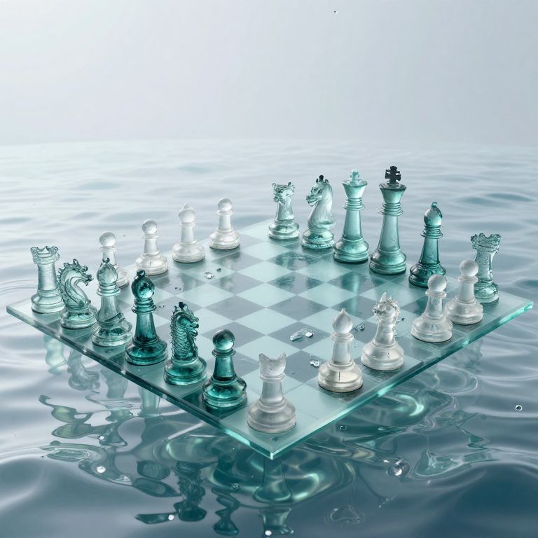 Photograph of a glass chessboard with translucent white and teal chess pieces floating on rippling blue water.