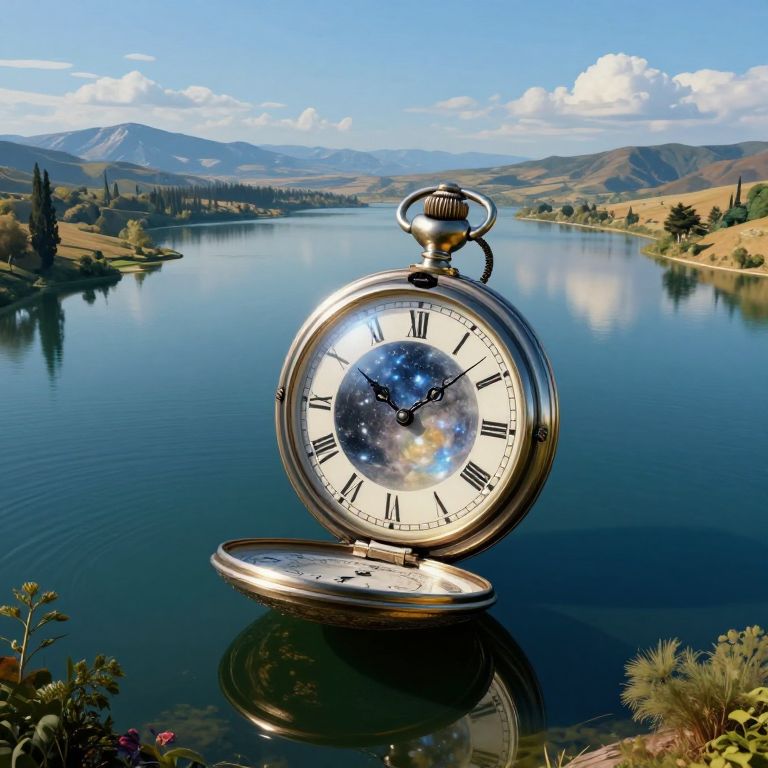 Photograph of a silver pocket watch with a reflective, starry sky face, open to show its white dial with black Roman numerals. The watch rests on a reflective surface near a calm, expansive lake surrounded by rolling hills and mountains under a bright blue sky with fluffy white clouds. The foreground includes greenery and small bushes, while the background showcases a scenic landscape with trees and distant hills. The image blends a realistic landscape with a surreal, reflective pocket watch.