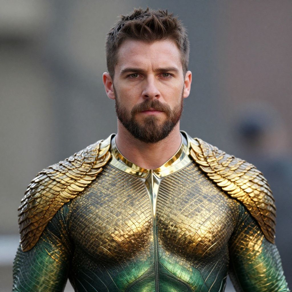 "justice league aquaman suit, 1boy, male focus, solo, facial hair, looking at viewer, armor, mustache, upper body, beard, brown hair, realistic, blurry background, blurry, bodysuit, short hair Realistic photo of casual sexy person with pretty face"