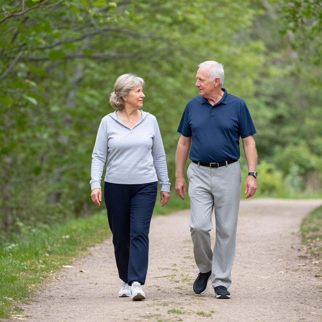 Photograph of an elderly couple walking on a gravel path in a lush, green park. The woman, with short gray hair, wears a white polo shirt, black pants, and white sneakers. The bald man, in a light blue polo shirt and beige pants, walks beside her, wearing black shoes. They walk side by side, smiling, with the woman on the left and the man on the right. The background includes dense green trees and foliage on either side of the path, which curves slightly into the distance. The image has vibrant colors and a natural, outdoor setting.
