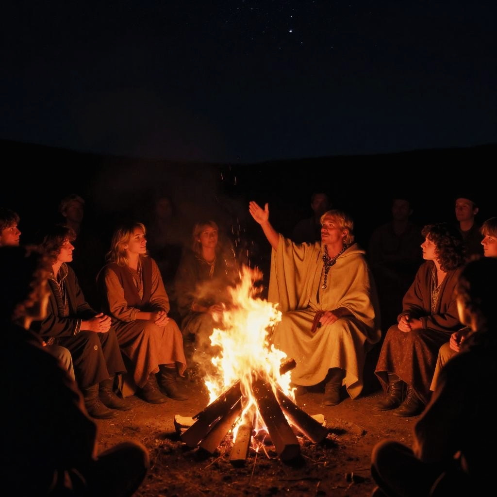 A group of people sitting around a brightly burning campfire at night, listening to a storyteller dressed in a flowing cloak. The scene is illuminated by the warm glow of the fire, set under a clear starry sky. The individuals are casually clad in rustic clothing, creating a cozy and atmospheric outdoor setting.