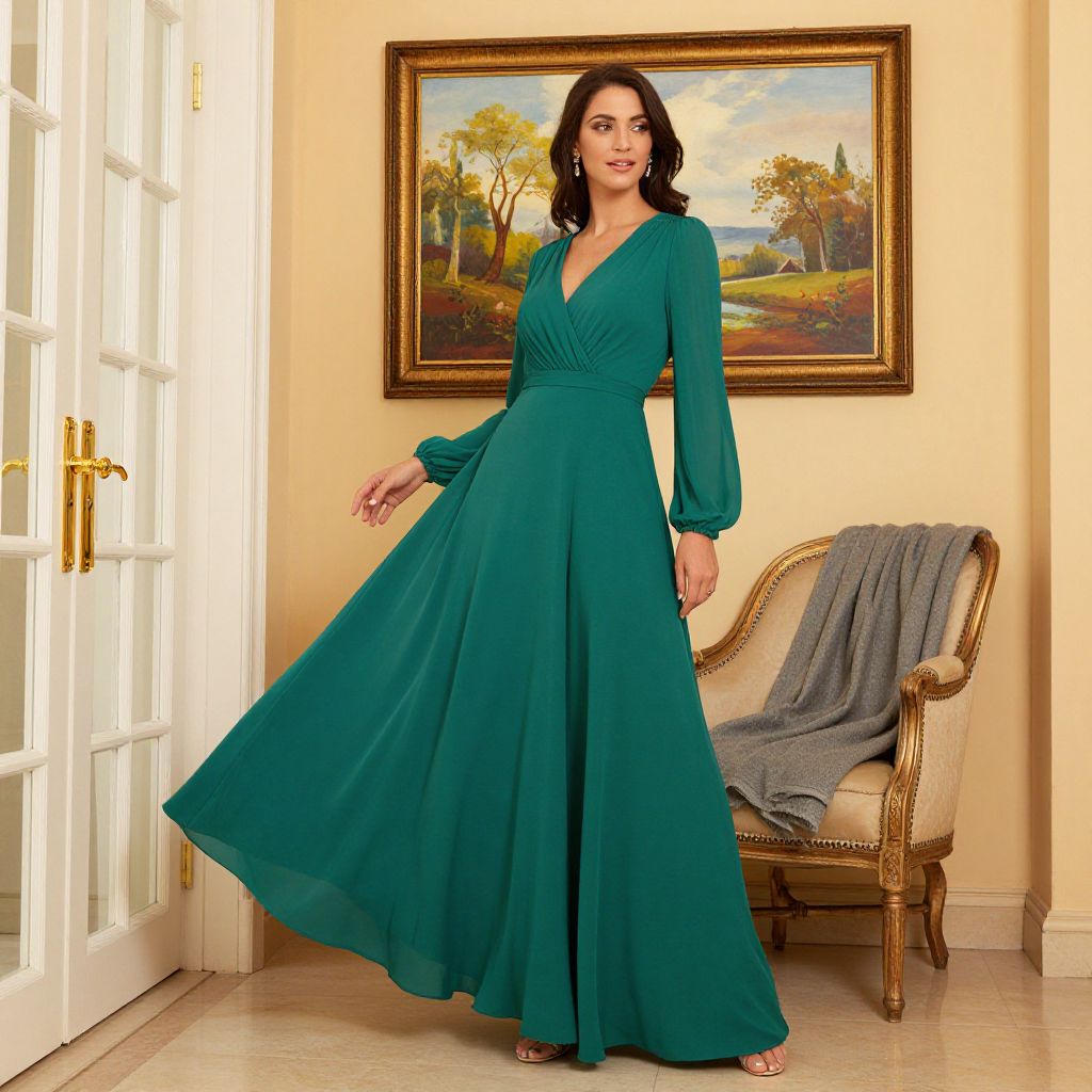 Elegant woman standing gracefully in a flowing emerald green gown with long sleeves, positioned near a French door with golden handles, while a framed landscape painting hangs above a vintage armchair draped with a gray throw, all set against a warmly lit interior backdrop.